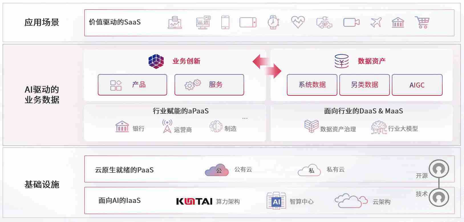 数字时代,,围绕企业数字化转型的关键要素,,,,优游ub8数码开创性的提出数云融合战略和技术体系框架,,,着力在云原生、、、、数字原生、、、、AI原生和信创产业上架构产品和服务能力,,,为处在不同数字化转型阶段的快消零售、、、汽车、、金融、、医疗、、、政企、、、、教育、、、运营商等行业客户提供泛在的敏捷IT能力和融合的数据驱动能力,,构建跨界融合创新的数字业务场景和新业务模式,,,,助力企业级客户建立面向未来的核心能力和竞争优势,,,,全面推动社会的数字化、、、、智能化转型升级。。。